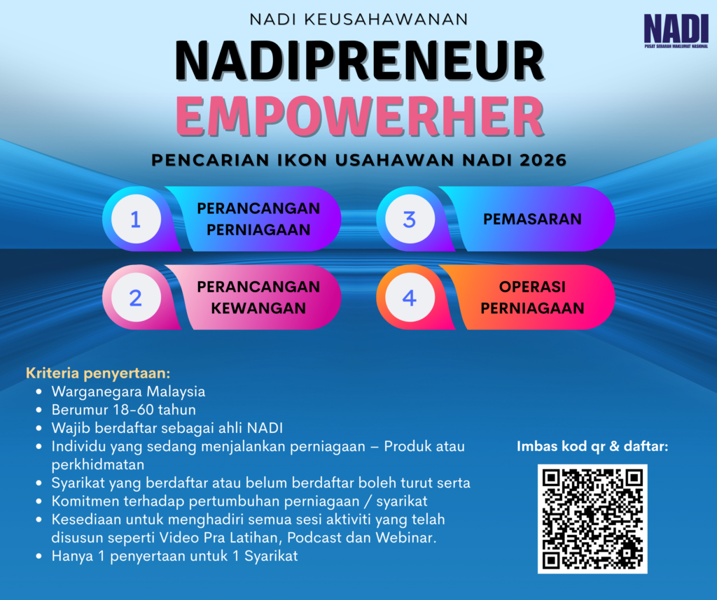 NADI menjemput semua usahawan wanita untuk menyertai program pembangunan keusahawanan NADIPRENEUR EMPOWERHER bagi melahirkan ikon usahawan yang berdaya saing, inovatif dan berimpak tinggi.